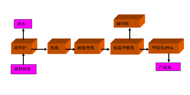 原料煤通过气化、变换、净化、PSA等单元得到高纯度氢气。